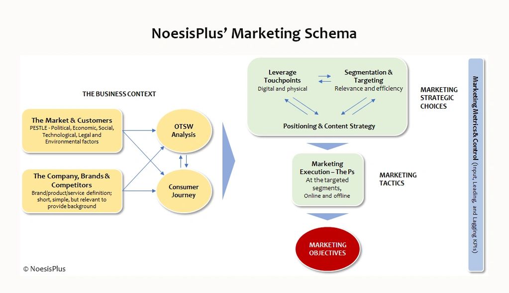 Understanding marketing strategic choices, execution, and metrics is essential for any business aiming for growth. Strategic choices involve identifying leverage points, target markets, and brand positioning, which set the foundation for marketing plans. Marketing execution is about implementing these strategies effectively through various channels, ensuring alignment with the overall business goals. Metrics play a critical role in assessing the success of these efforts; they offer insights into customer behavior, campaign performance, and ROI, guiding continuous improvement and strategic adjustments. Together, NoesisPlus creates a marketing schema for informed, impactful marketing decisions.