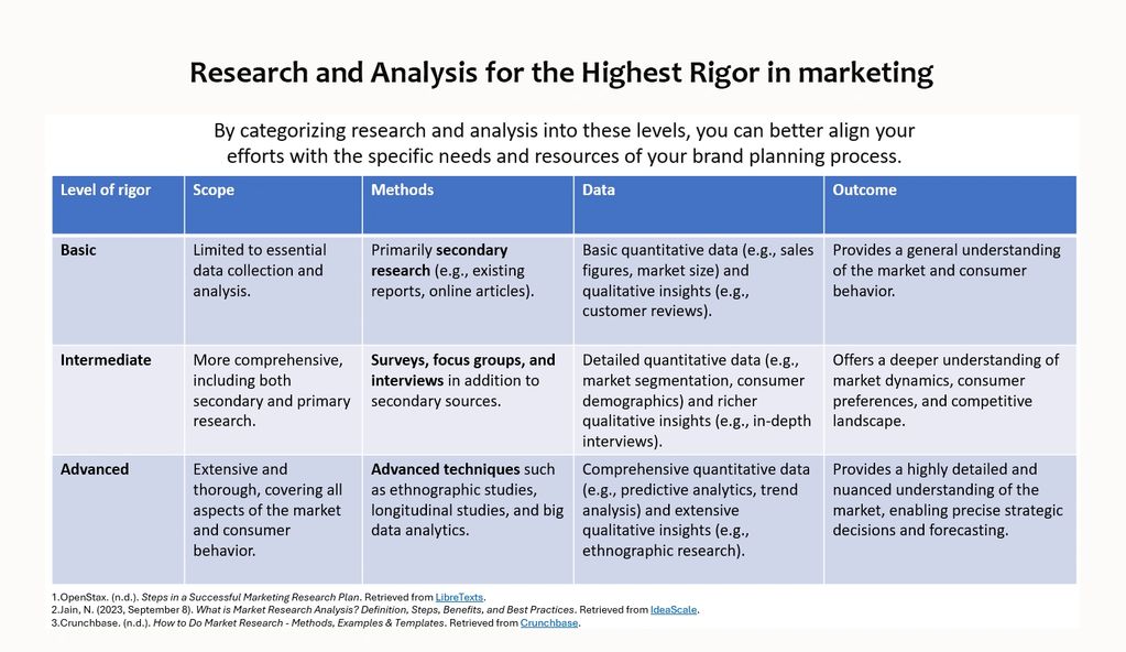 Conducting thorough research and analysis is essential for achieving excellence in marketing. By organizing your research and analysis into distinct levels, you can more effectively tailor your approach to meet the unique requirements and resources of your brand planning process. This structured method ensures that your marketing efforts are strategically aligned and comprehensive.